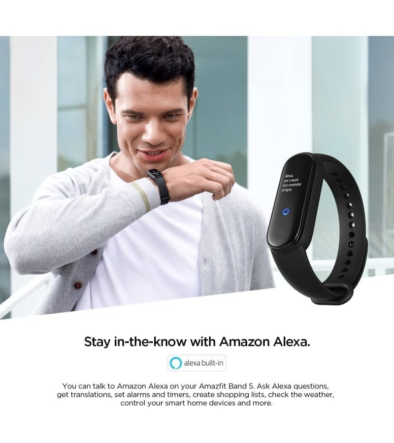 AMAZON ALEXA BUILT-IN: Talk to Amazon Alexa on your Amazfit Band 5. Ask questions. get translations. set alarms. and timers. create shopping lists. check the weather. control your smart home devices. and more.