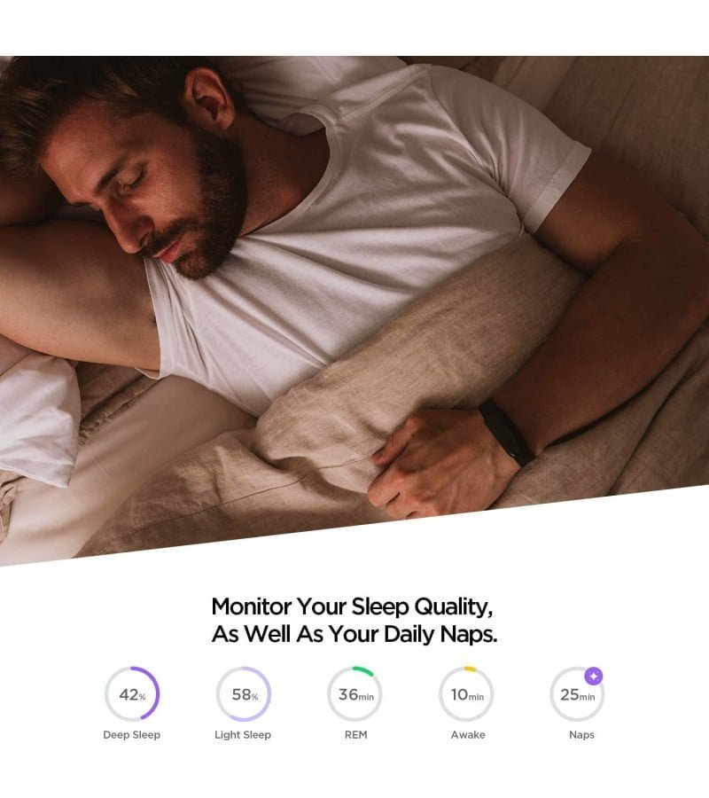 Monitor Your Sleep Quality. As Well As Your Daily NapsAmazfit Band 5 professionally interprets the sleep characteristics at each stage and analyze sleep quality. to help you adjust your sleep habits. It even monitors your 20-minute daily nap. |