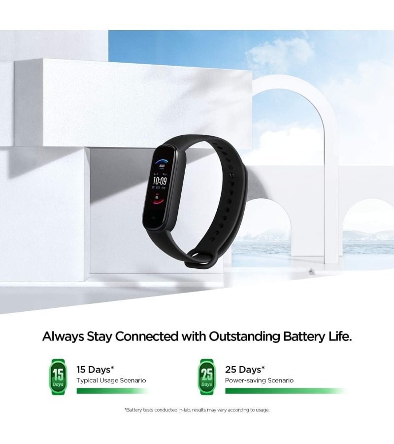 Keep Connected to Your Life. Not Your ChargerSay goodbye to daily recharge. With a fully charged Amazfit Band 5. you don’t need to bring a charger for a two-week trip. |