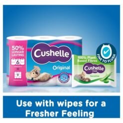 Cushelle Original Toilet Tissue 16 x 50% Longer Lasting Rolls*. Cushelle Original is made with Micro Air pockets that make it ooh sooo soft and highly absorbent for a comfortable clean feeling every time. Now longer rolls. so if it seems like it??s lasting longer. that??s because it is! Use with Cushelle Fresh Toilet Wipes for a fresher. cleaner feeling. *50% Longer Lasting Rolls. compared to standard rolls. 16 Original Toilet Tissue Rolls. 270 sheets per roll