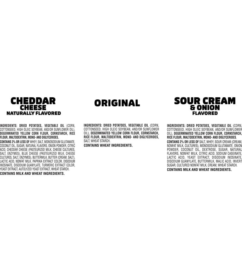 Satisfy your snack craving with the irresistible taste of original flavor. cheddar cheese flavor. and sour cream and onion flavor potato crisps; uniquely shaped and seasoned from edge to edge