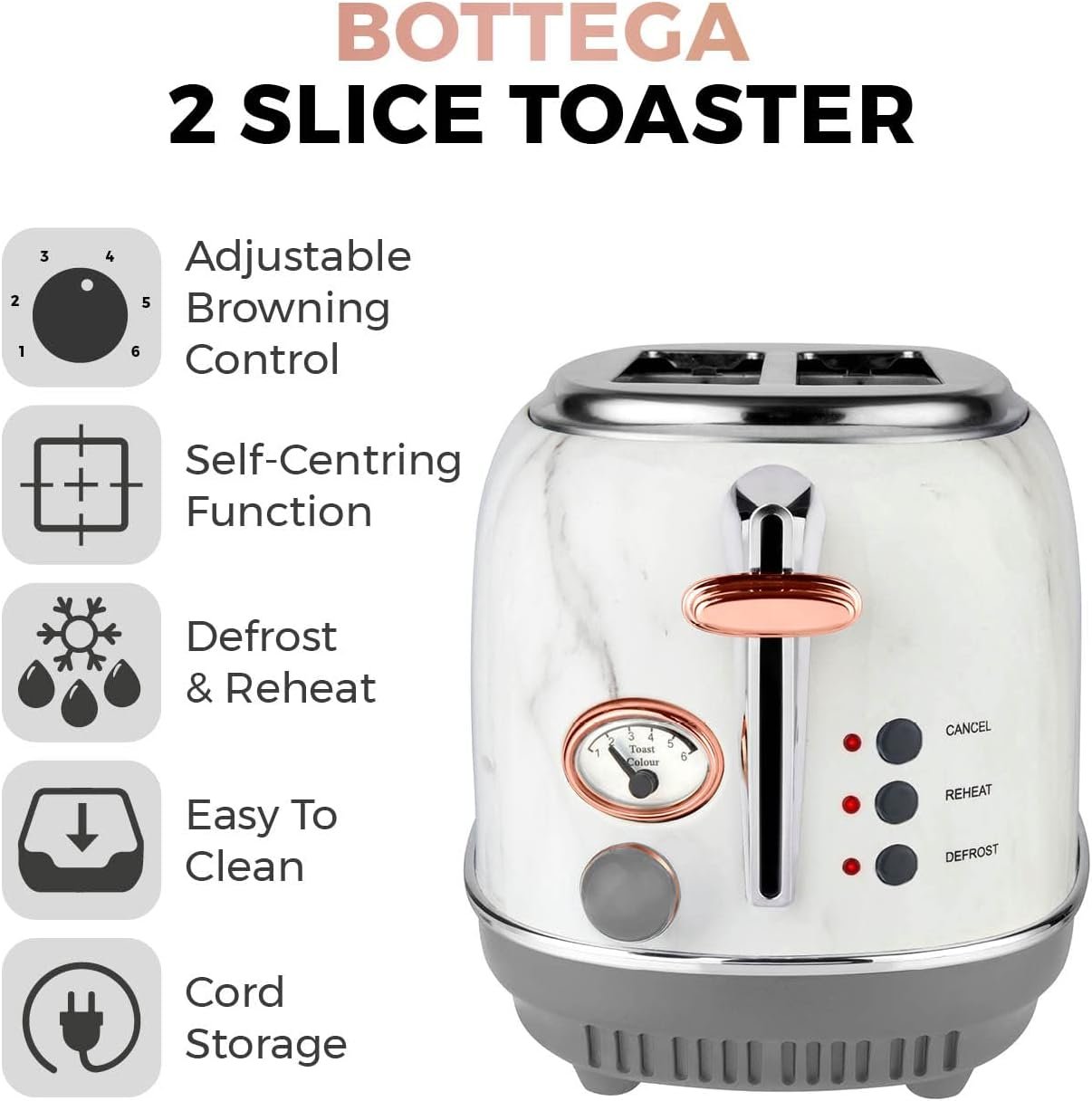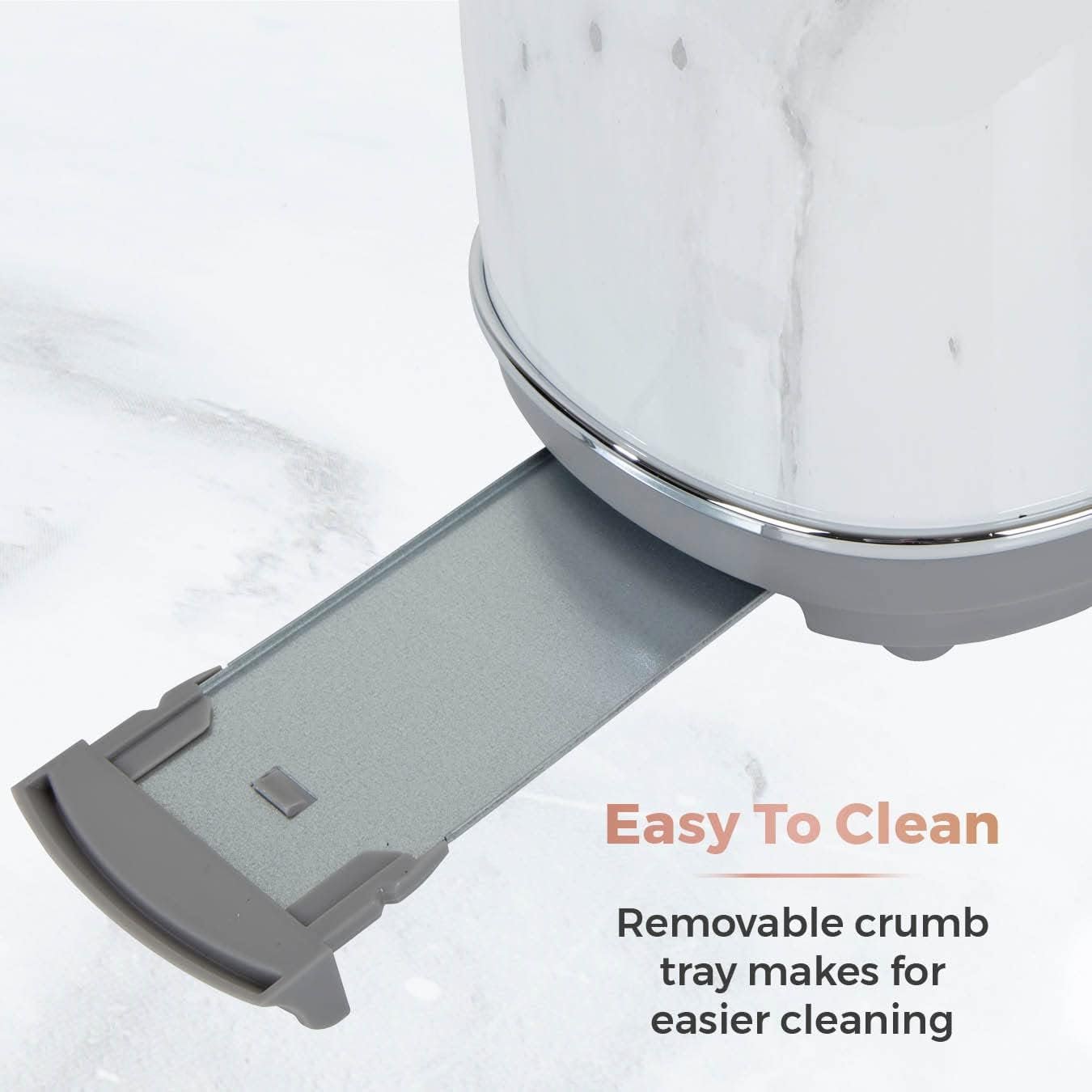 Designed with contemporary White Marble exterior and Rose Gold browning control and leaver for a stylish finish on your worktop. The variable width slots accommodate bread slices of different sizes. with a self-centering function to ensure even coverage. The controls allow you to cancel toasting at any time. with a reheat and defrost function you can toast straight from the freezer. The removable crumb tray and cable storage help to dispose of mess easily and keep your worktop tidy.