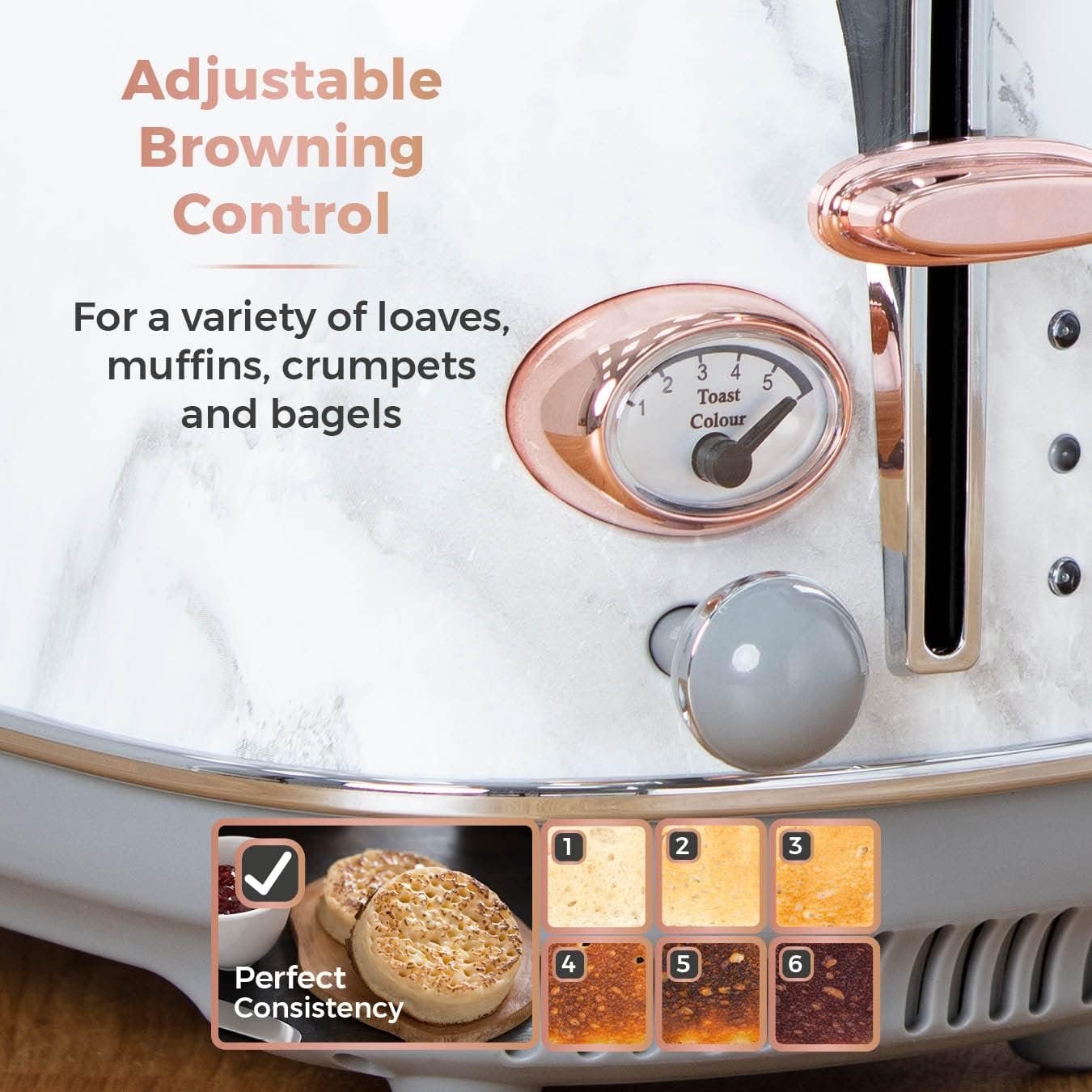 - ADJUSTABLE BROWNING CONTROL: Choose from a range of settings for bread. muffins. crumpets and bagels