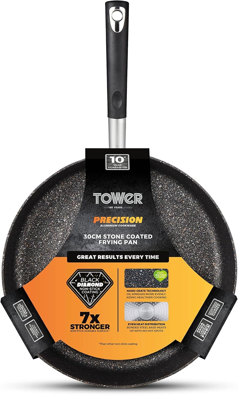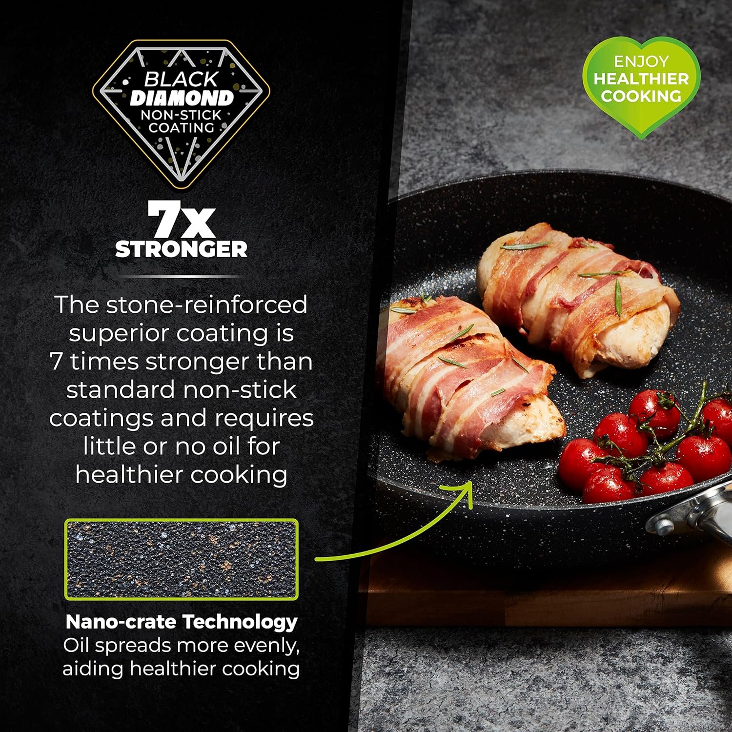 - BLACK DIAMOND COATING: The stone-reinforced superior coating is 7 times stronger than standard non-stick coating and requires little or no oil for healthier cooking