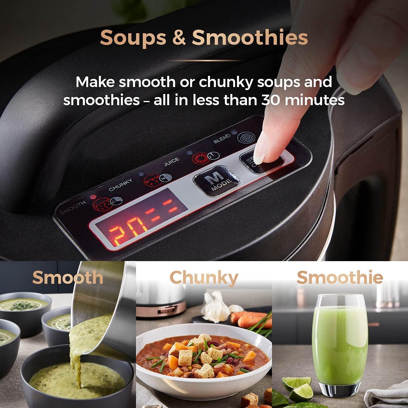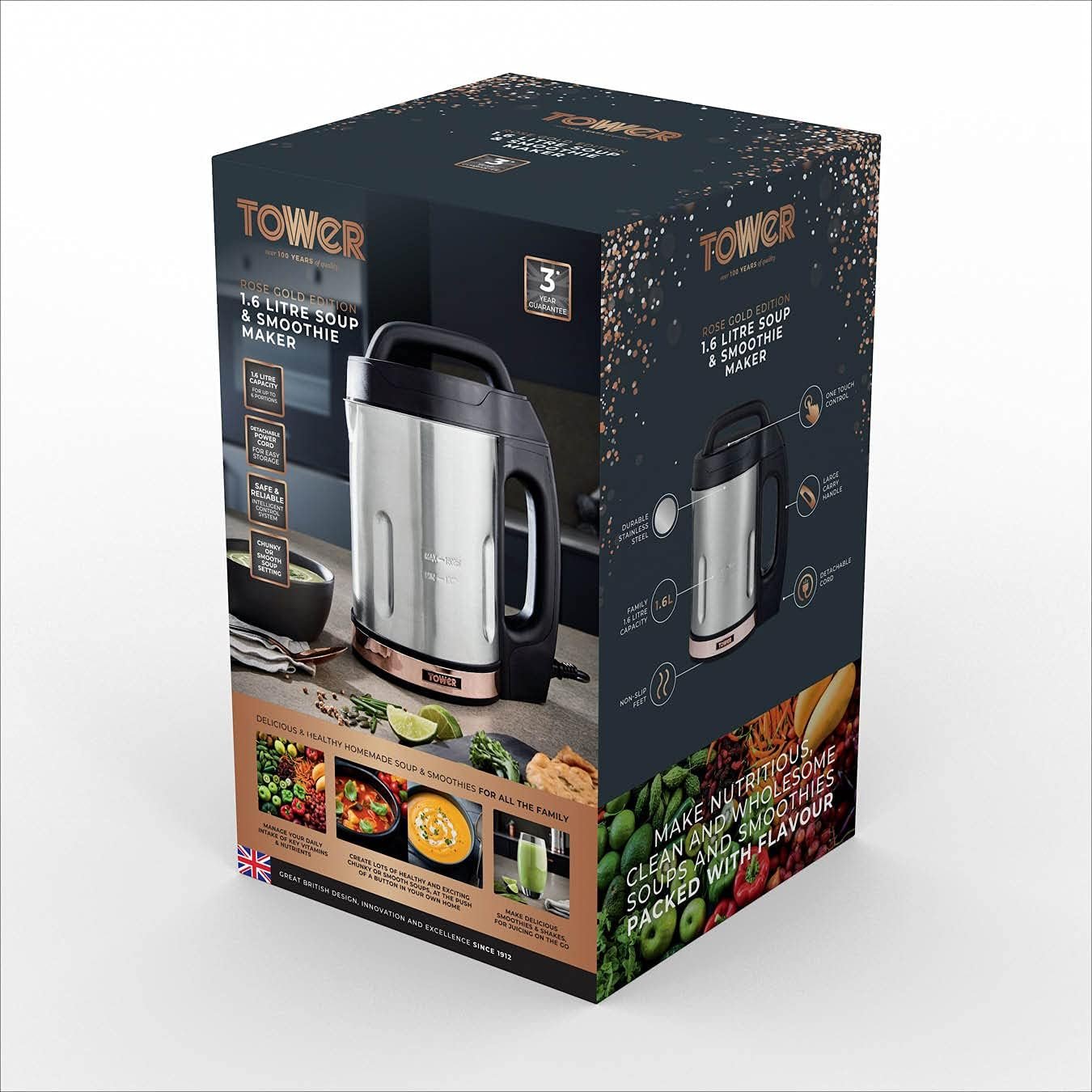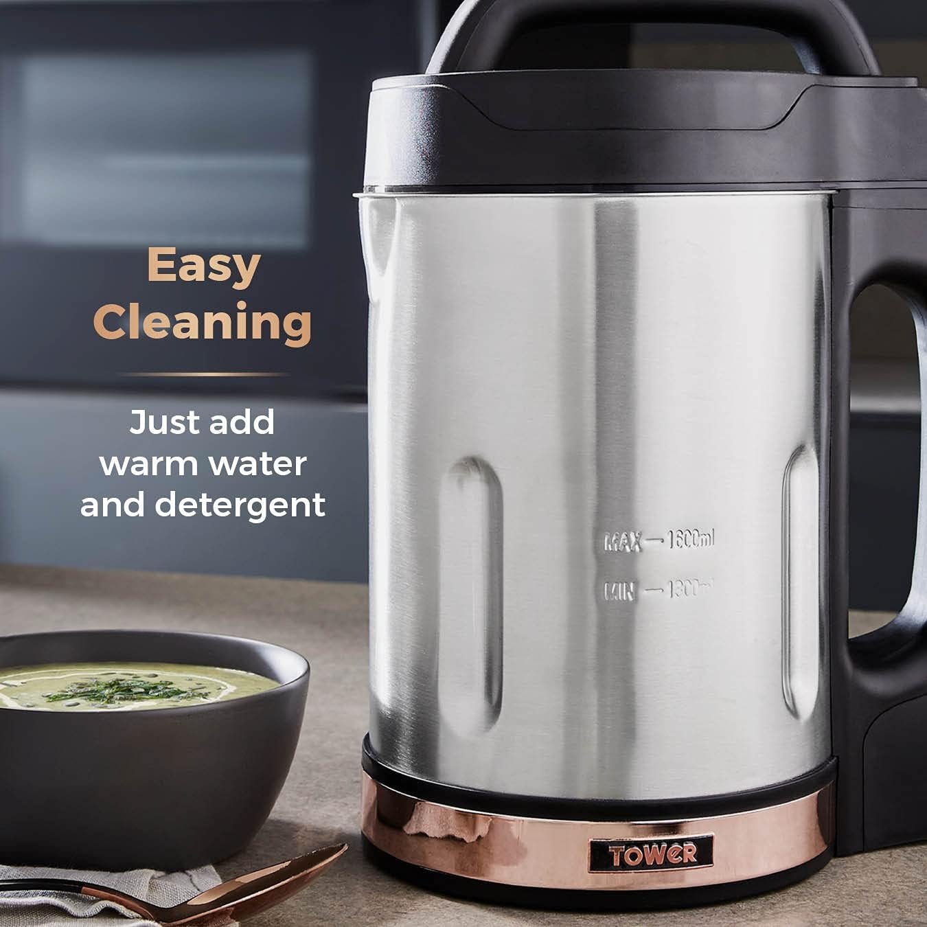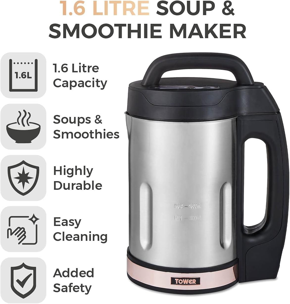 Tower T12031RG Soup & Smoothie Maker with Intelligent Control System and Stainless Steel Jug and Blade. 1000W. 1.6 Litre. Stainless Steel & Rose Gold