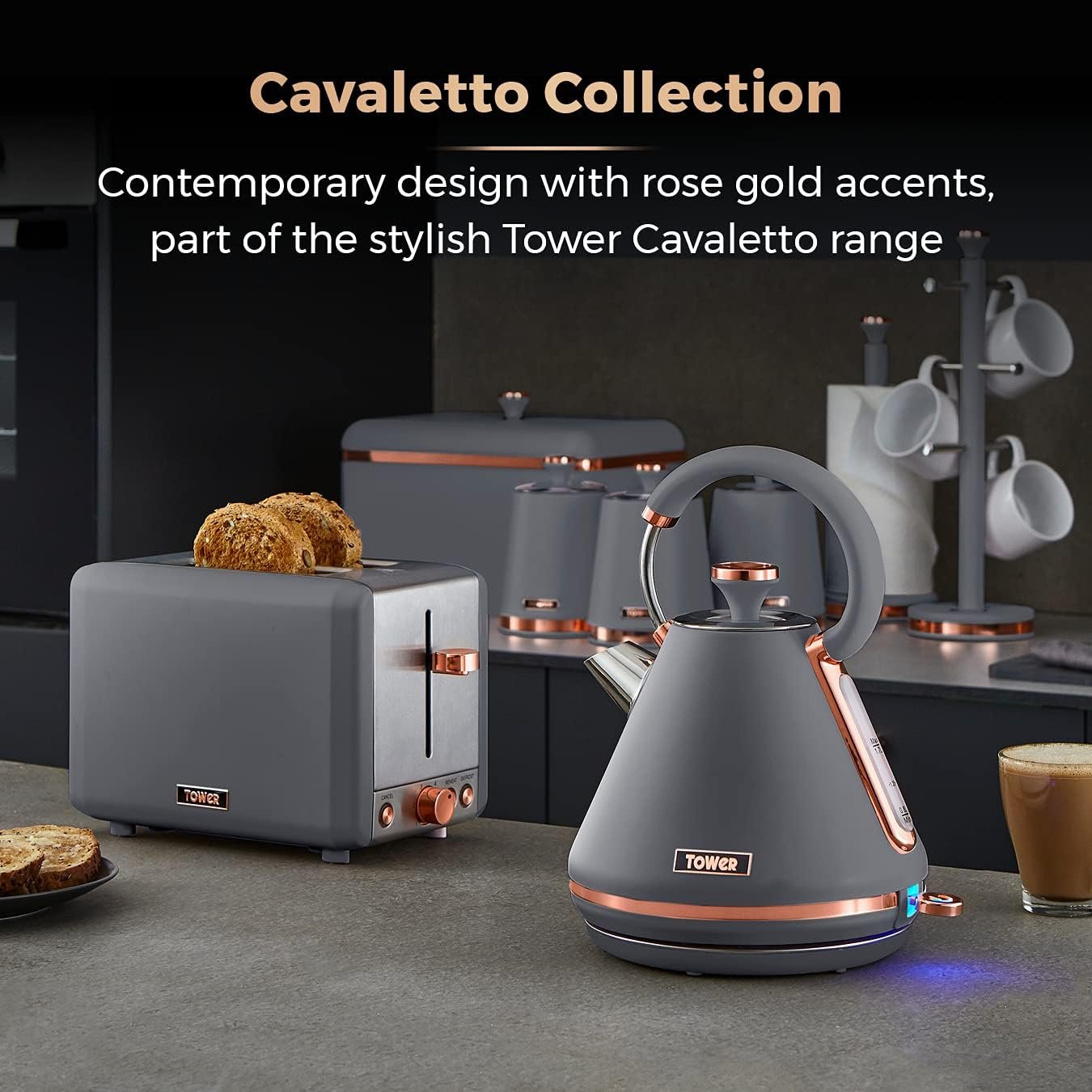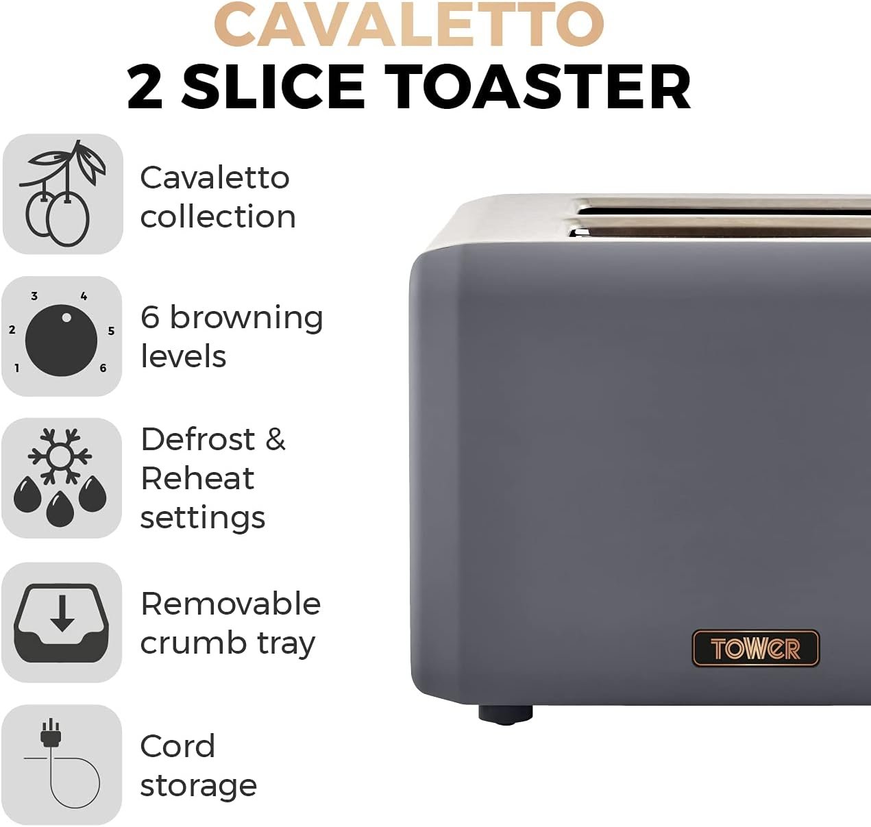 - CAVALETTO COLLECTION: Ultra-modern 4-slice toaster with matte finish and lustrous rose gold accents adds a touch of elegance to your kitchen. Part of the co-ordinating Cavaletto collection from Tower