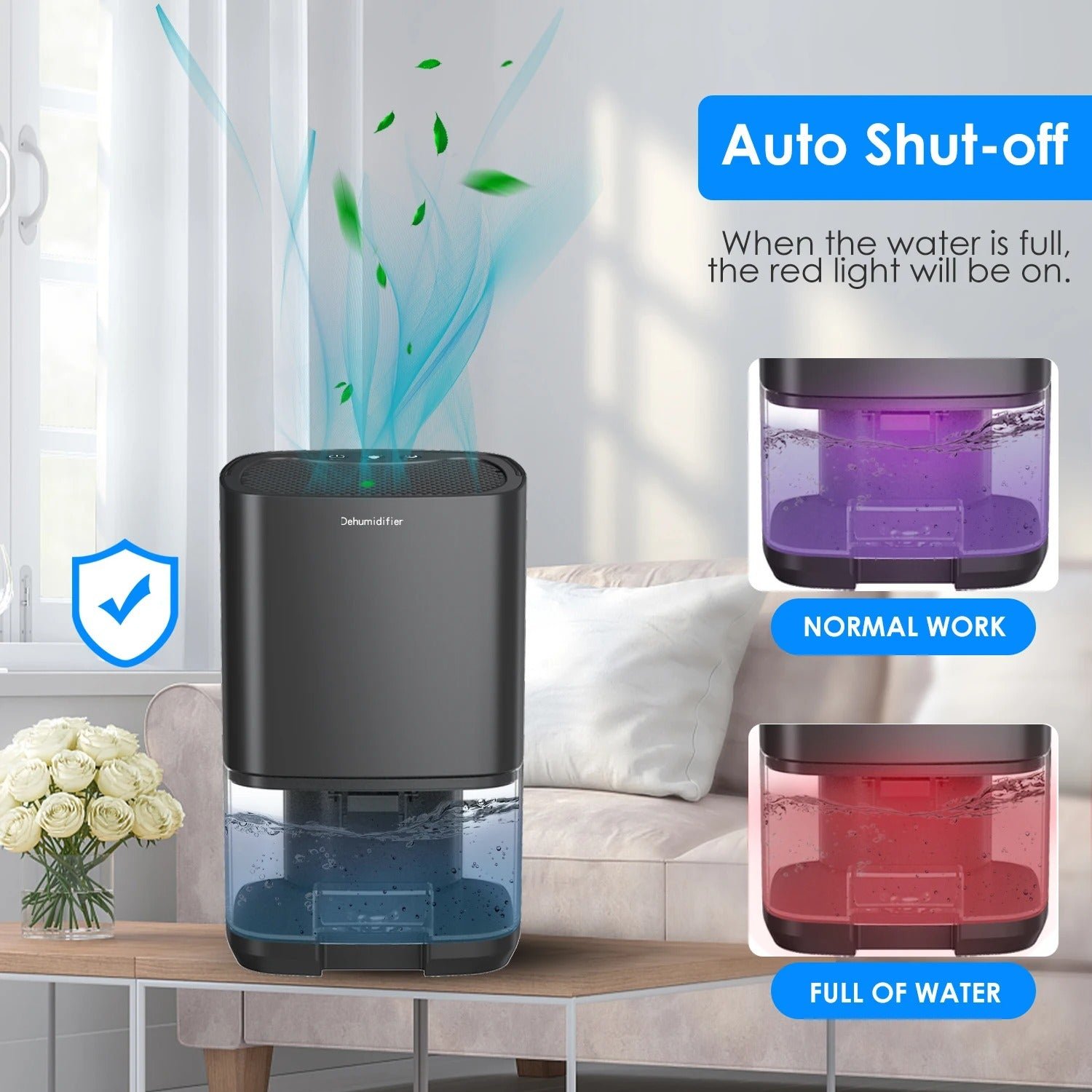 - Auto Shut-Off & Indicator Light: The dehumidifier shuts off automatically once the tank is full and includes a visible water level indicator for ease of use.